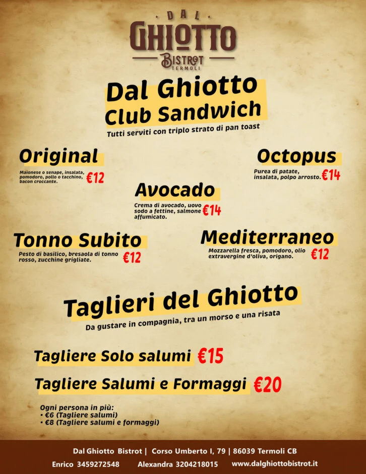 Il Club Sandwich è un grande classico internazionale che al Dal Ghiotto Bistrot trova una nuova vita: ingredienti freschi, abbinamenti ricercati e il nostro immancabile triplo strato di pane tostato.